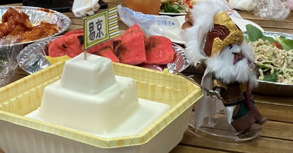 易京城豆腐はメインディッシュ的な扱いで、決壊させて食べるという。公孫瓚の最期に籠もった城で有名。『三国志』巻八魏書公孫瓚伝に「瓚軍數敗、乃走還易京固守。為圍塹十重、於塹裏築京、皆高五六丈、為樓其上;中塹為京、特高十丈、自居焉、積穀三百萬斛。十重も塹壕と壁で囲んだ堅固な城だそうで。東の端のバーテンダーの方が劉備好きで、西の端の参加者が公孫瓚好きってことで、盧植門下兄弟それぞれのファンがそろって、しかもお互いにしゃべって盛り上がっていたこともあって、なかなか楽しい場だったし、何より料理が美味しかった。